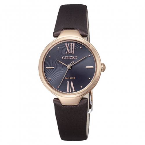 Orologio Citizen, Movimento Eco-Drive (a carica luce infinita), riserva di carica di 240 giorni. Cassa in acciaio, cinturino in morbida pelle, vetro minerale. WR 5 bar. Diametro cassa 28 mm. Referenza: Lady EM0042-17E